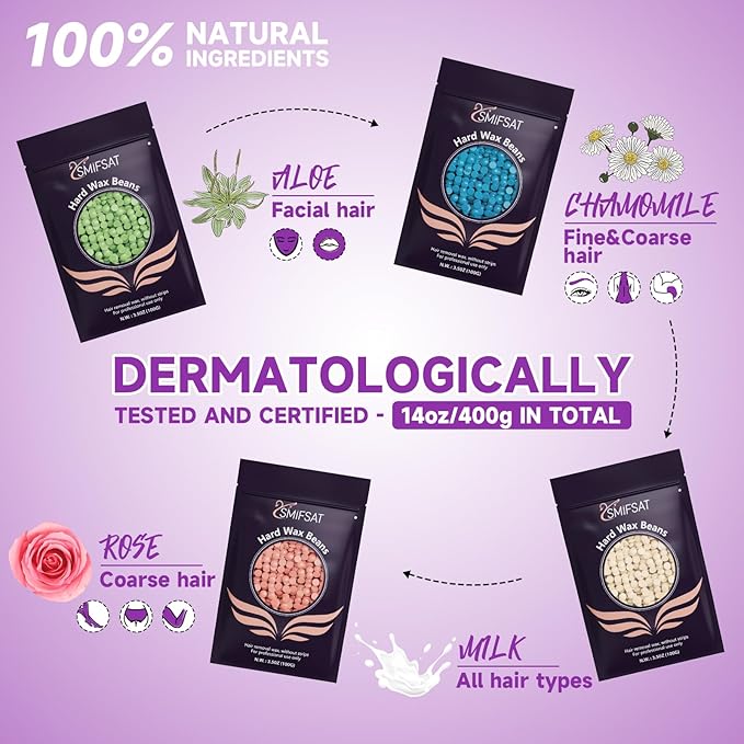 - 【❤️Natural ingredients, gentle care】Hair removal wax beans are selected from natural beeswax or plant wax ingredients, and the formula is mild and non-irritating. The set contains 4 packs of natural hard wax beans with different fragrances (chamomile, rose, aloe vera, milk, a total of 14.1 ounces), with natural plant extracts before and after care spray, dermatologically tested and certified, suitable for all skin types, sensitive skin can also be used with confidence.