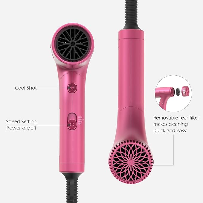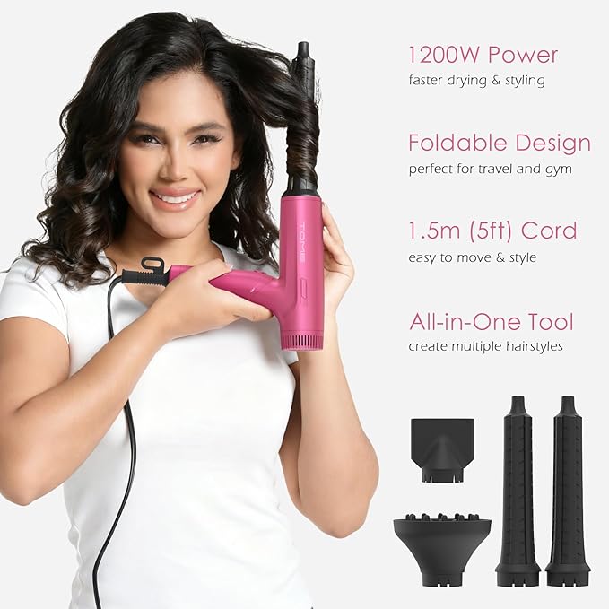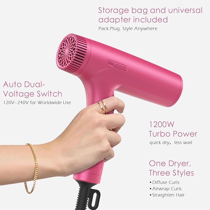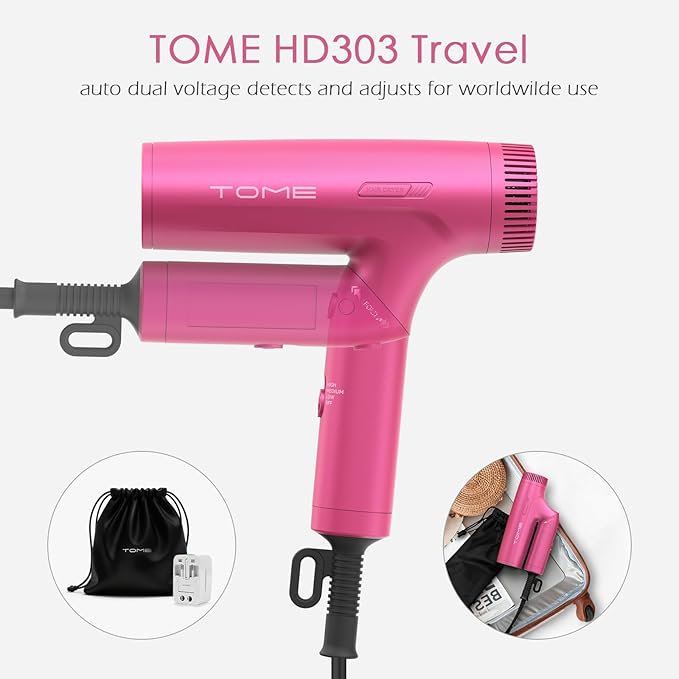 TOME 1200W Hair Dryer Travel Dual Voltage 120V/240V Foldable Blow Dryer with Diffuser Comb Nozzle Storage Bag Universal Power Adapter (Hot Pink)