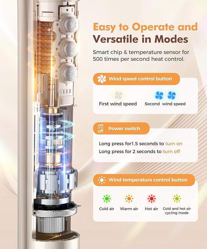 - Precise Heat Control & Triple Safety: This 6 in 1 hair dryer for women features 3 heat settings (Room Temperature/140°F/185°F) and 2 speed modes to adapt to soft, medium, or thick hair. Hold the button for 2 seconds to activate alternating cool/hot airflow—cool air locks in shine, while hot air sets long-lasting curls. Built-in NTC sensors monitor temperature 500 times per second, keeping airflow below 230°F for safety, paired with a ceramic-coated design for even heat distribution