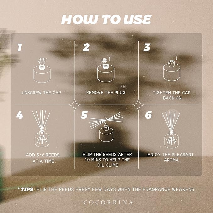 - Easy Scent Control: On the first use, flip the sticks after 1-2 hours to release the full scent. Adjust the number of reed sticks to customize fragrance intensity. Refresh scent by flipping the reeds. For best results, use 3–5 reeds per bottle