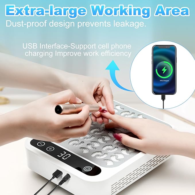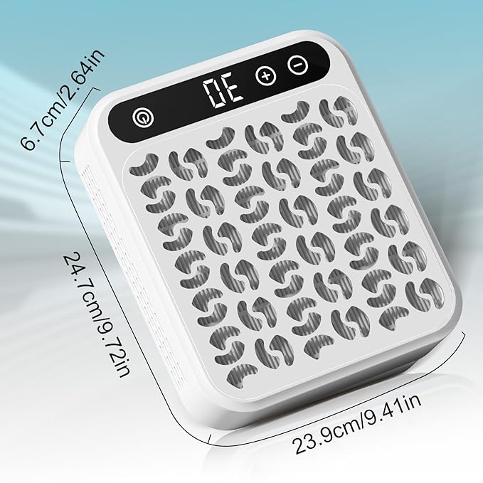 - Low Noise Design and Adjustable Suction:This nail dust collector operates at low noise levels, making it comfortable to use during filing. With a touch control panel, you can effortlessly adjust the suction strength to accommodate different requirements.