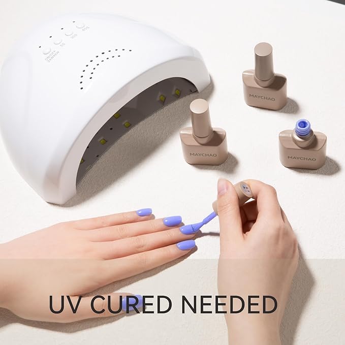 - Fast and Simple Nail Polish: MAYCHAO Gel polish must be cured under an LED light. It is necessary to apply a base and top coat. Average LED light duration is 60-120 seconds. Simple application and tenacity.
