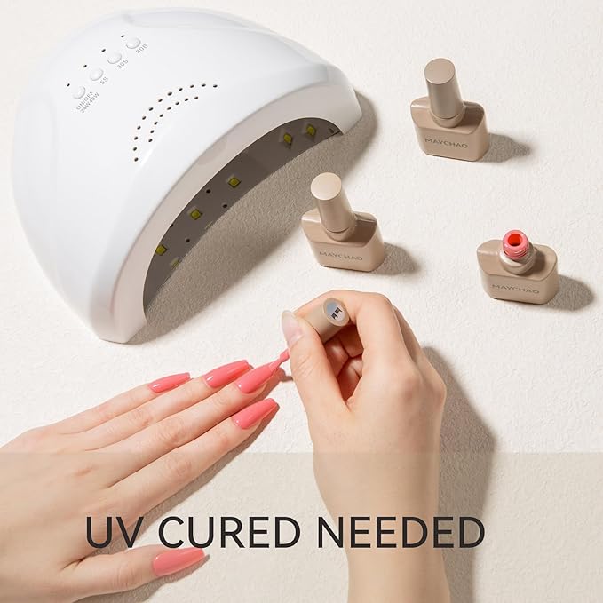 - Fast and Simple Nail Polish: MAYCHAO Gel polish must be cured under an LED light. It is necessary to apply a base and top coat. Average LED light duration is 60-120 seconds. Simple application and tenacity.