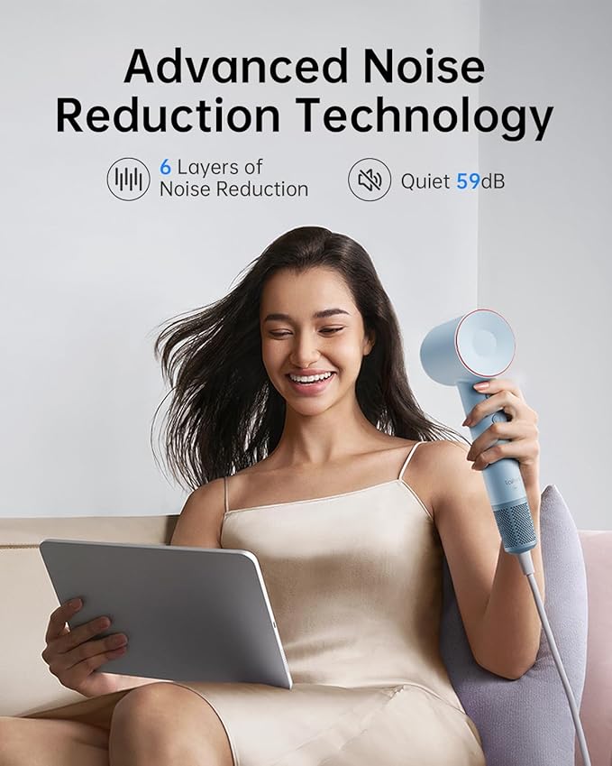 - [4-Color LED Ring Light & Low Noise] The three colors displayed on the circular LED ring correspond to temperature settings of hair dryer. Red indicates 80 degrees (hot air), yellow is 50 degrees (warm air), blue is cold air. Press and hold for two seconds to activate circulating mode shifting hot and cold air every few seconds. Despite the powerful motor and wind speed, the Laifen hair dryer operates at 59db while in use and is non-disruptive.