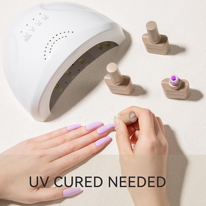 - Fast and Simple Nail Polish: MAYCHAO Gel polish must be cured under an LED light. It is necessary to apply a base and top coat. Average LED light duration is 60-120 seconds. Simple application and tenacity.