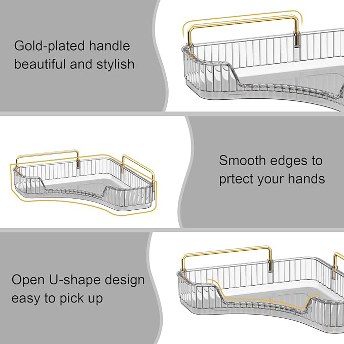 - [Simple Design]: Makeup organize use of highly transparent ABS material, fashionable and simple design, so that it can adapt to a variety of decoration styles, gorgeously display on the dresser, bathroom, table, countertop,Keep your item organized and make your items looks more fancy in this tray.