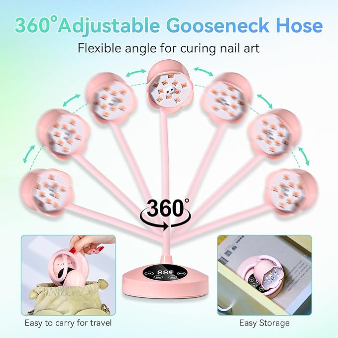 - Portable & Flexible Gooseneck: The size of the pink gel lamp is (Unfolded): 3.7 inches * 3.7 inches * 12.8 inches (Flexible hose: 9.6 inches), small and lightweight. The portable nail curing light with gooseneck can be bent 360 degrees freely, allowing the UV lamp’s height and direction to be adjusted flexibly, ensuring the wireless gel nail lamp always finds the perfect position.
