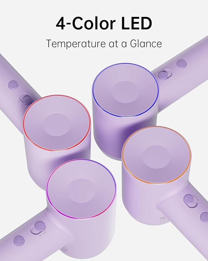 - [4-Color LED Ring Light & Low Noise] The three colors displayed on the circular LED ring correspond to temperature settings of hair dryer. Red indicates 80 degrees (hot air), yellow is 50 degrees (warm air), blue is cold air. Press and hold for two seconds to activate circulating mode shifting hot and cold air every few seconds. Despite the powerful motor and wind speed, the Laifen hair dryer operates at 59db while in use and is non-disruptive.