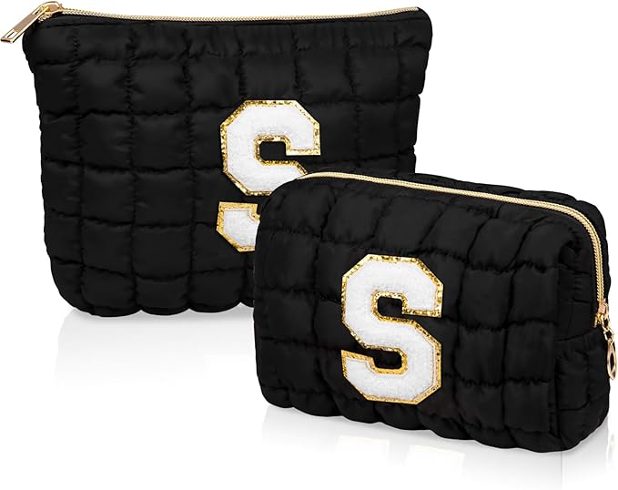 2PCS Initial Checkered Makeup Bag, Large Quilted Cosmetic Bag, Cute Make up Pouch for Purse, Travel Toiletry Storage Bag for Women Preppy Teen Girls Gift Trendy Stuff Gift (Black S)