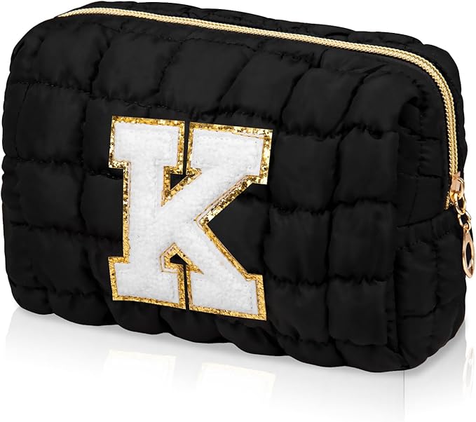 Initial Checkered Makeup Bag, Large Quilted Cosmetic Bag, Cute Make up Pouch for Purse, Travel Toiletry Storage Bag for Women Preppy Teen Girls Gift Trendy Stuff Gift (Black K)