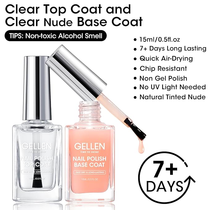 Gellen Clear Nail Polish Base Top Coat, No Wipe Shine Top Coat & 4-In-1 Tinted Nude Base Coat Strengthens Nails - Calcium, Quick Dry Natural Color Regular Nail Polish, Not UV Gel, Hema Free, Non-toxic