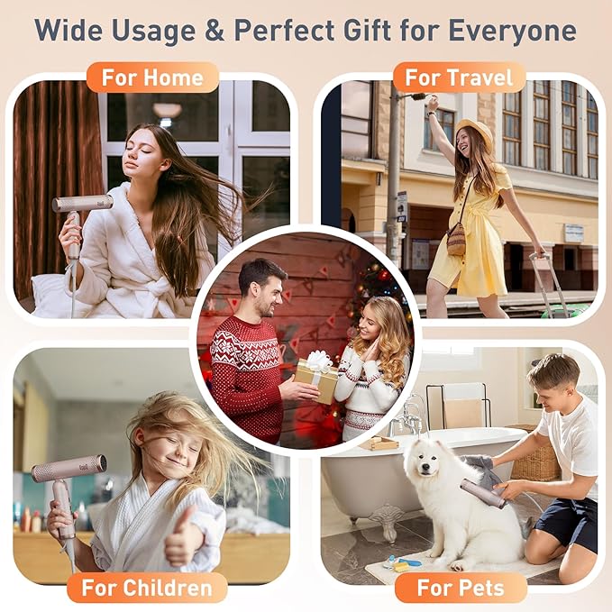 - Dual Voltage & Safe Design: Blow dryer supports 120V and 220–240V, ensuring compatibility worldwide. No voltage converter is needed (Note: In Europe or other regions, you need to prepare a suitable plug adapter). It also comes with a US UL-certified ALCI safety plug and built-in overheat protection that shuts off if too hot—keeping you safe at home or abroad.