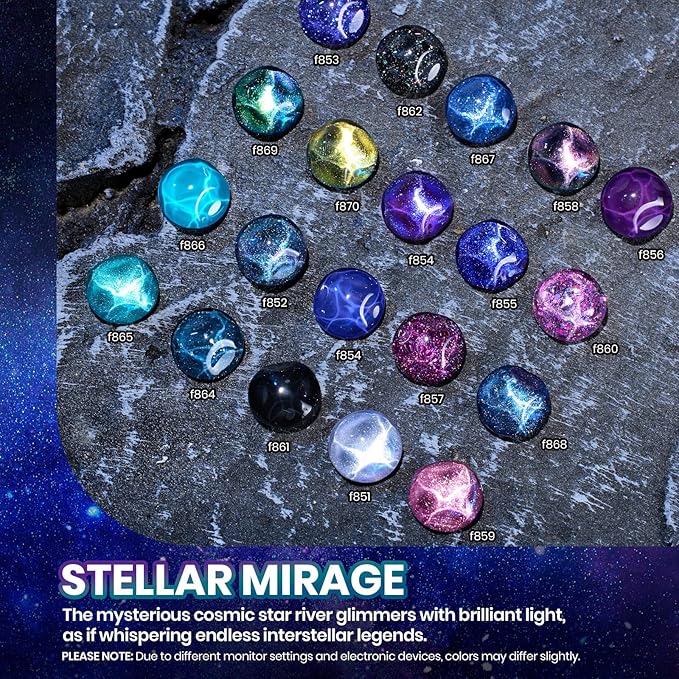 - Stellar Mirage Collection – Color That Shifts Like Magic: Experience the universe at your fingertips. This 20-color chameleon gel polish set transforms between shades of black, purple, and blue — combining cat-eye magnetic sparkle with temperature-changing effects for endless cosmic nail looks.