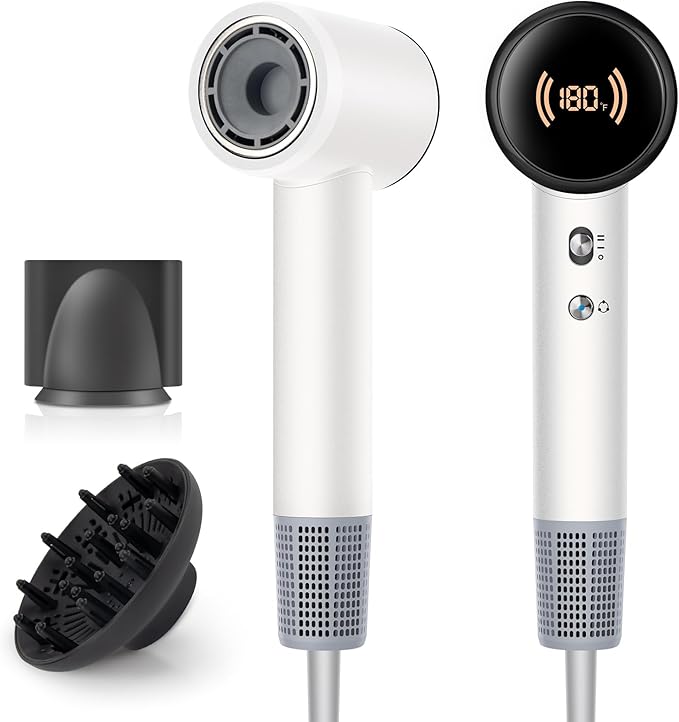 - HD DISPLAY WITH 3 TEMPERATURE SETTINGS & 2 SPEEDS: Our hair dryer includes an excellent temperature control system,This fast-drying hair dryer helps you achieve the perfect look with 3 heat modes (105°F/180°F/250°F) and 2 airflow speeds. The real-time HD display lets you instantly adjust airflow—ideal for thick curls at 250°F or gentle care for fine hair at 105°F. Long-press the temperature button to switch to Cycle Temperature mode. It locks in shine, minimizes damage,and delivers salon-worthy results through smart heat control.it's an excellent choice for family and friends.
