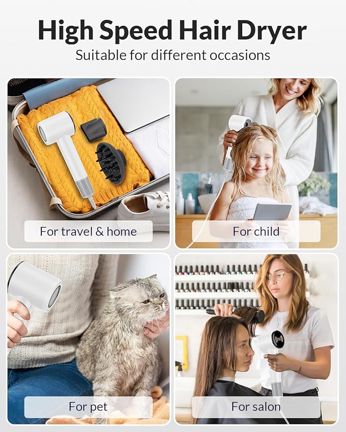 Hair Dryer,Travel Hair Dryer with Diffuser,110000 RPM High Speed Ionic Blow Dryer,Temperature Display,Low Noise&Lightweight Blow Dryer,Fast-Drying,No Heat Damage,Suitable for All Hairstyles(White)
