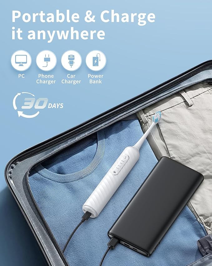 - 【Waterproof & Rechargeable】: The electric toothbrush with IPX7 is waterproof design inside and outside, providing dual protection to prevent water leaks and you can use it in the shower. This rechargeable oral irrigator with a powerful 1100mAh lithium battery, which can last for 30 days once fully charged, making it an ideal choice for both travel and home use