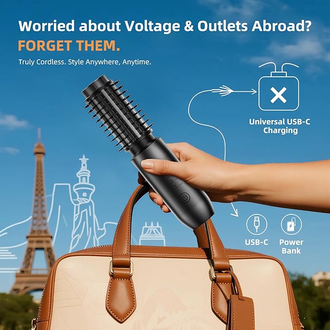 - 【Your Cordless Travel & Gym Companion】 Free yourself from outlets and tangled cords. A compact, TSA-friendly heated round brush is a new travel essential. Fully cordless with universal USB-C charging, it’s ready for a weekend getaway, international trip, or post-workout glam-up. Experience the freedom of flawless hair, anywhere.