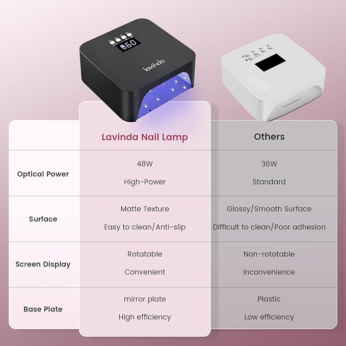 - 【7 Years Expertise & Chic Design】 Crafted with over 7 years of professional nail product R&D experience, the Lavinda Nail Lamp delivers both high performance and elegant style. This gel nail UV light lamp combines beauty and function, Available in classic black and white, as well as a rose gold finish with a matte texture, it’s not only a reliable tool but also a stylish accessory. making it an ideal present for anyone who values quality and design.