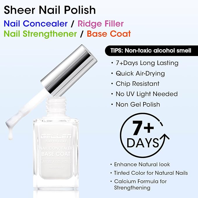 Gellen 4-In-1 Illuminating Nail Concealer Base Coat Polish Milky White, Nail Strengthener Ridge Filler For Nails, Sheer Nail Polish Smooth Strengthen Natural Nails, Quick Air Dry, Hema Free, Non-toxic