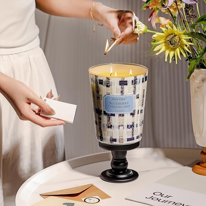 - 【Blueberry Cheesecake Fragrance for Relaxation】3-Wick Candles capture the essence of Blueberry Cheesecake with its fruity, tangy top notes, a heart of creamy cheesecake, and a sweet, indulgent base of vanilla and graham cracker. perfect for cultivating a serene ambiance in living rooms, bedrooms, or bathrooms.