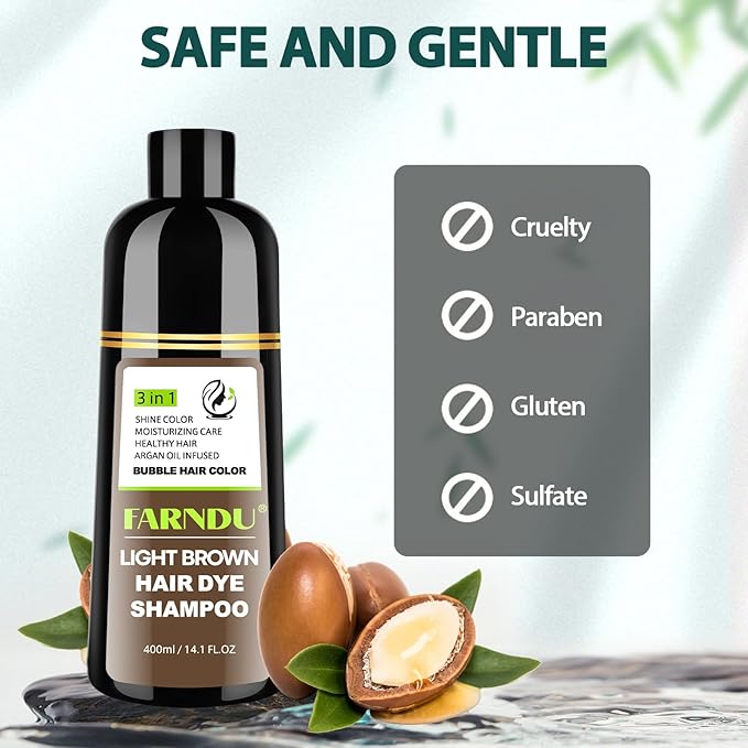 FARNDU Light Brown Hair Dye Shampoo 3 in 1 with Argan Oil – 10-15 Min Gray Coverage, Natural Instant Hair Color Shampoo for Women and Men, Long-Lasting Up to 6 Months, Ideal Christmas Gifts
