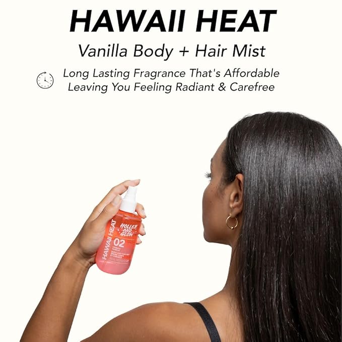 Holler and Glow Hawaii Heat Body & Hair Mist, Warm Vanilla, Peony & Amber Scent, Long-Lasting Daily Fragrance, Lightweight, Vegan, Cruelty-Free, Alcohol-Free, Hydrating Hair Perfume, 8.11 Fl Oz