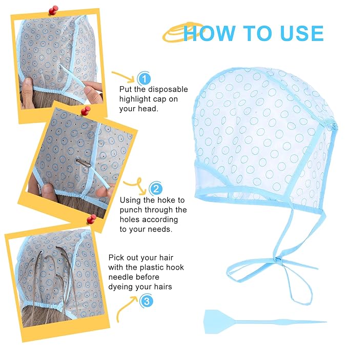 - Easy to Use: Just put on the highlight caps for hair and tie the attached ties together at the neck for a secure fit, then use the crochet of the highlights cap to pierce the hole, pull out the hair to be dyed, and then you can start dyeing. Use our hair highlighting cap to dye your hair, and your friends or passers-by will be amazed by your eye-catching hair color!