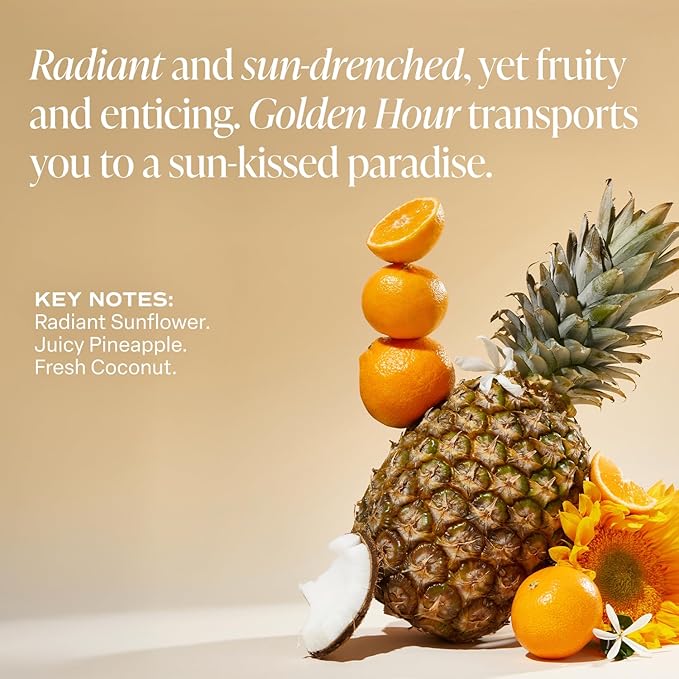 - GOLDEN HOUR FRAGRANCE: Radiant Sunflower, Juicy Pineapple, and Fresh Coconut is a fresh and uplifting tropical blend, bursting with sunny florals, luscious fruit, and creamy, beachy warmth. Sun-drenched and enticing, Golden Hour transports you to a sun-kissed paradise.