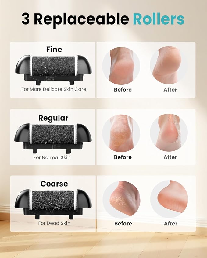 - Multi-Head System with 3 Adjustable Rollers: Includes coarse, medium, and fine sander rollers and extra heads for every skin type—from rough heels to delicate soles for smooth touch-ups. Easily select your desired level of exfoliation with this professional-grade tool. Non-RF device, purely for mechanical exfoliation.