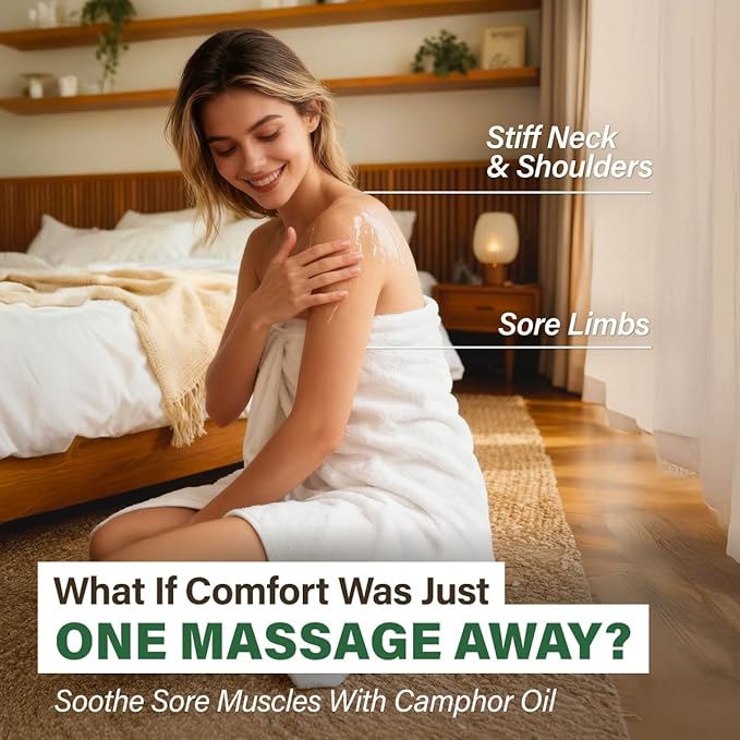 - Revel in post-workout comfort with camphor essential oil for sore muscles. Soothe muscle tension with a fresh-scented massage as you dilute 3-4 drops with carrier oils, offering a pampering touch that supports daily comfort.