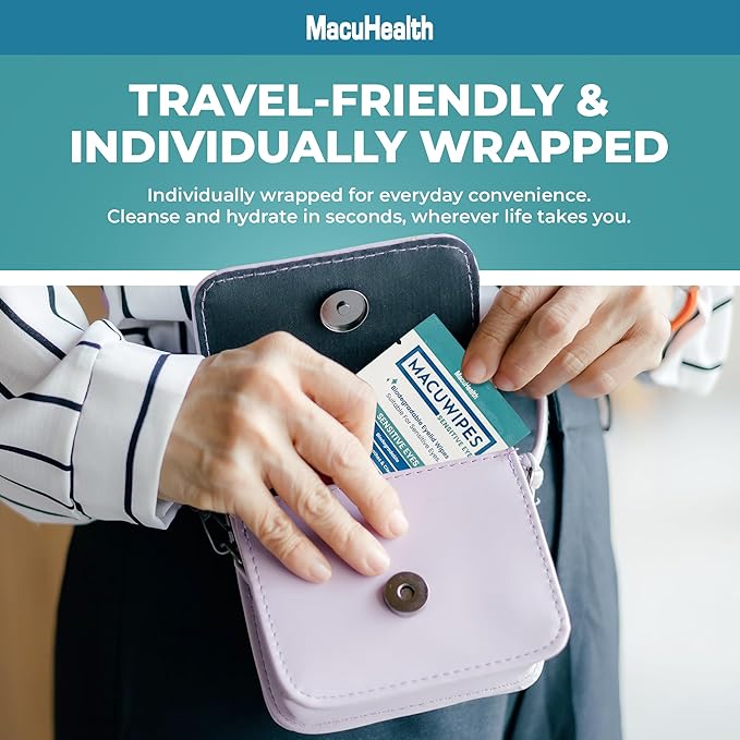 - GENTLE EYELID WIPES FOR SENSITIVE EYES: MacuHealth MacuWipes Tea Tree offer a gentle solution for dry, sore, or gritty eyes. These pre-moistened wipes hydrate and cleanse the eye area, reducing irritation from prolonged screen use or environmental factors.