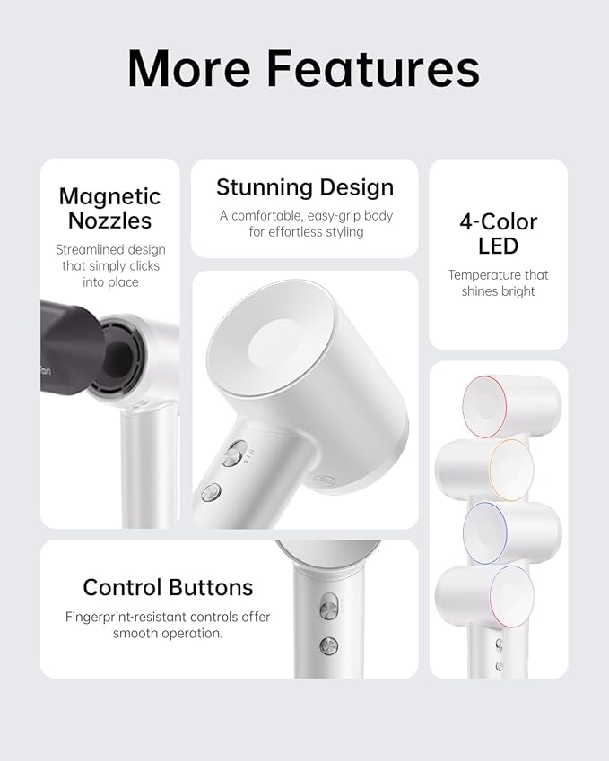 - 【High-Speed Brushless Motor & Fast Drying】Laifen hair dryer is equipped with a 110,000 RPM high-speed brushless motor, wind speed reaches 22m/s. Strong airflow can dry hair faster, speed up your routine.