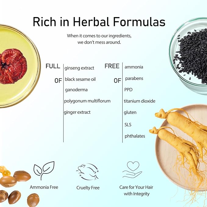 - [HERBAL FORMULAS] Rich in herbal ingredients (ginseng, black sesame, ginger), natural hair color shamopoo is mild, works for all hair types. The hair coloring shampoo only hangs on to the surface of hair shell, safe for your hair. Shampoo hair dye leaves your hair soft and glossy.