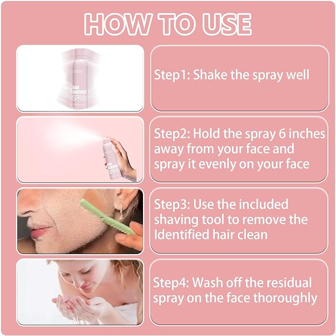 - Instantly Reveals Fine Facial Hair for Precise Removal--Our lightweight spray temporarily highlights even the finest, invisible "peach fuzz" on your face, neck, or décolletage. Simply mist it on—no staining or residue—to see hairs clearly.