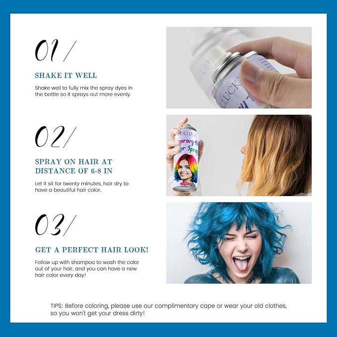 - Suitable for all occasions: Hair dye spray is safe for children and adults and is a great way to express your creativity. Whether it's Halloween, a music festival, cosplay, school spirit day, photography, or a fun night out, this hair color spray will give you an instant glow.