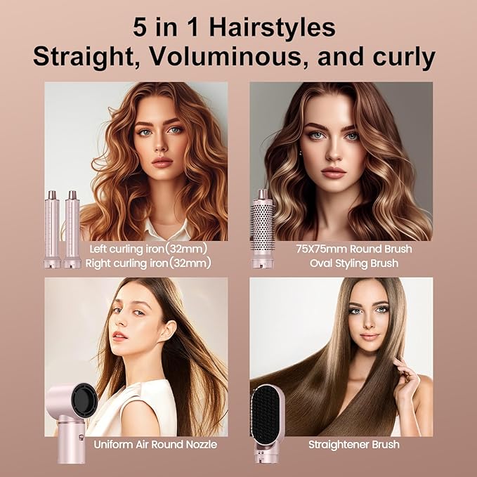 - Versatile Styling Tool: This 5 in 1 hair styler that combines a hot air brush, curling wand, straightening brush, and volumizing brush. Can meet various hairstyle needs at home, including drying and curling hair needs