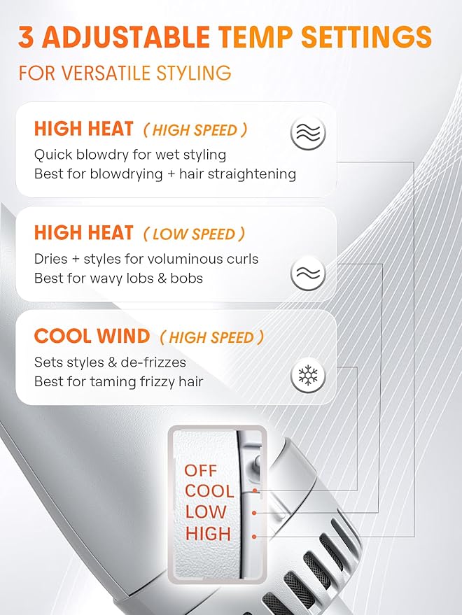 - 3X Faster Drying - 33000 RPM professional motor cuts styling time in half with 3 heat settings (330°F/300°F/265°F) for all hair types