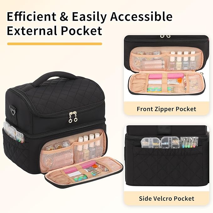 - Double Layer Design: This nail polish storage bag features a unique double-layer design. The upper layer - a removable 10-slot nail polish organizer board + a large mesh zipper pocket + 2 small elastic pockets + an adjustable velcro divider. The lower layer - a removable 38-slot nail polish organizer board, 3 elastic pockets with clear lid for nail tools and nail supplies