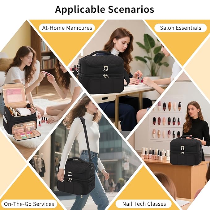 - Large Capacity Design: Holds 48 nail polish bottles + full manicure kit + pedicure stuff. The spacious compartment can accommodate full-size nail lamps. Dimensions: 12.2"×9"×9"