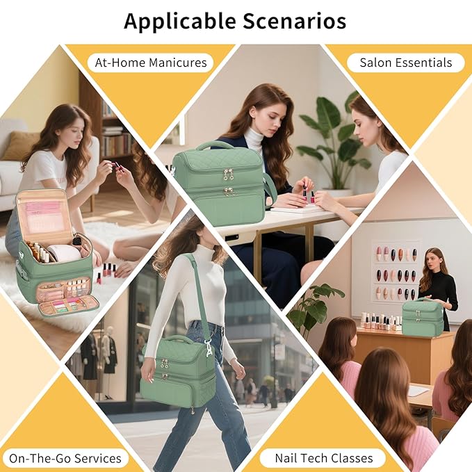 - Large Capacity Design: Holds 48 nail polish bottles + full manicure kit + pedicure stuff. The spacious compartment can accommodate full-size nail lamps. Dimensions: 12.2"×9"×9"