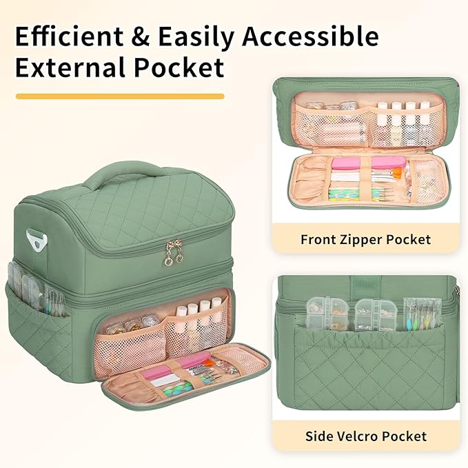 - Double Layer Design: This nail polish storage bag features a unique double-layer design. The upper layer - a removable 10-slot nail polish organizer board + a large mesh zipper pocket + 2 small elastic pockets + an adjustable velcro divider. The lower layer - a removable 38-slot nail polish organizer board, 3 elastic pockets with clear lid for nail tools and nail supplies