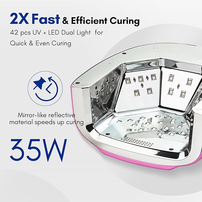 - Ultra-Fast Curing: Experience salon-speed results at home with our powerful UV LED nail lamp. Equipped with 42 premium dual light source beads (365nm + 395nm), it cures all types of gel polish—base coat, top coat, builder gel, poly gel, rhinestone glue—up to 2x faster than standard lamps. Say goodbye to long wait times and hello to flawless nails in minutes.