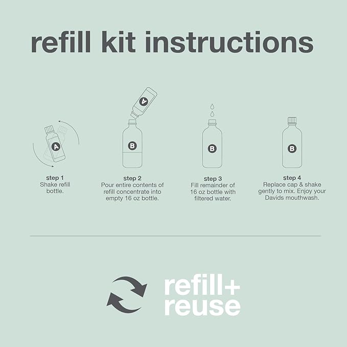 - INNOVATIVE REFILL AND REUSE SUSTAINABLE PACKAGE: Kit contains a refillable and reusable glass bottle and 4 ounces of Davids Hydroxi Fresh Breath Mouthwash Concentrate. Simply pour the concentrate into the bottle and fill with filtered water. This helps to significantly reduce plastic waste and support a sustainable lifestyle while getting the absolute best mouthwash possible.