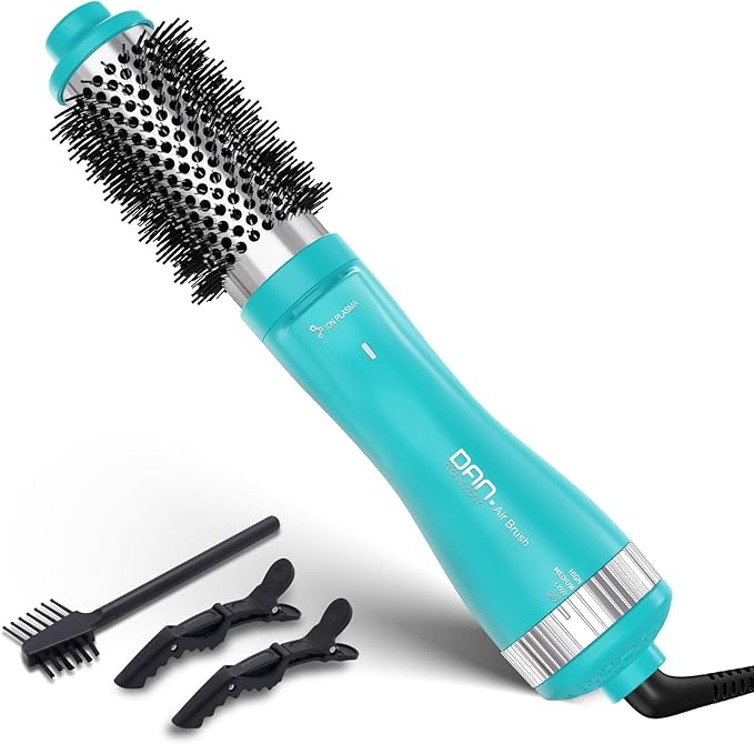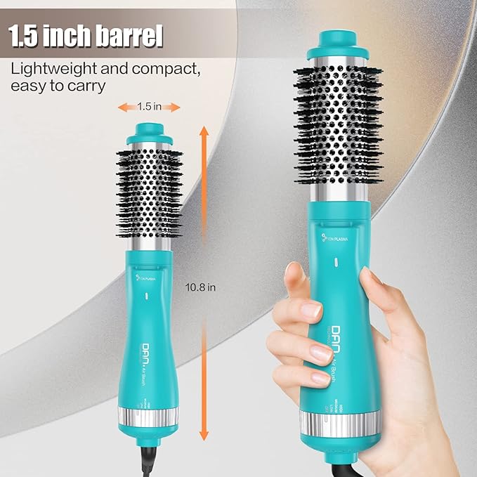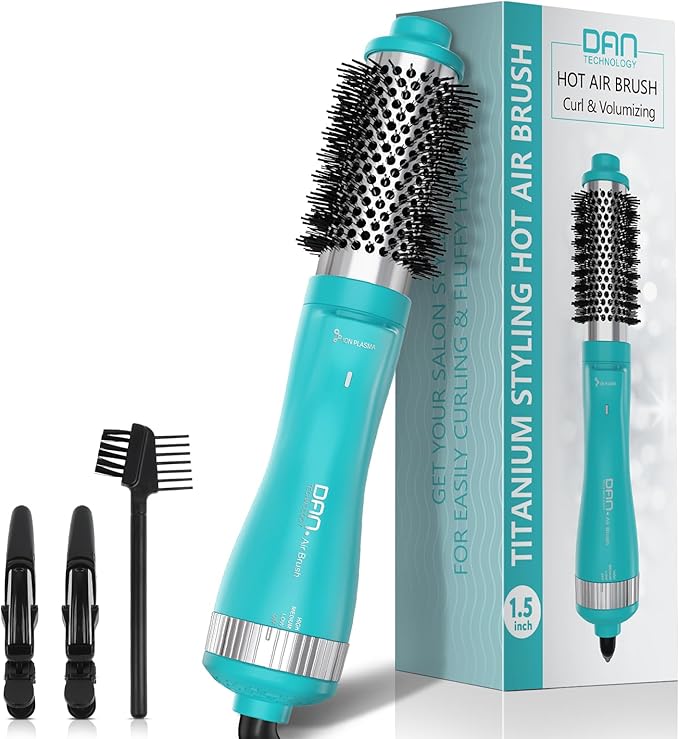 Dan Technology 1.5 Inch Titanium-Ceramic Hot Air Thermal Brush, Heated Round Barrel Blowout Brush with Negative Ions for Smooth Volume & Shiny Hair, Gentle Airflow 2 Speeds & 3 Heat Settings 120V Cyan