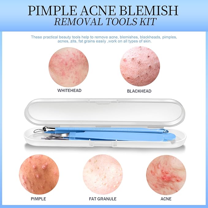 - Portable and Organized Storage: Each tool comes stored in a convenient, washable plastic case that ensures easy organization and transport. Silicone covers for precision tweezers are included, and it’s essential to use tools only on fully matured acne to minimize skin irritation