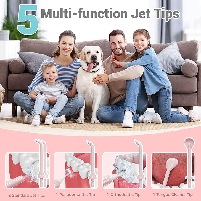 - 【350ML large water tank and 5 adjustable modes】The 350ml large water tank ensures sufficient and uninterrupted oral cleaning without repeated water addition.Picks for teeth cleaning and flossing provides five modes including Strong,Normal,Soft,Pulse and Child modes.It is recommended to select "Child" mode for the first time use