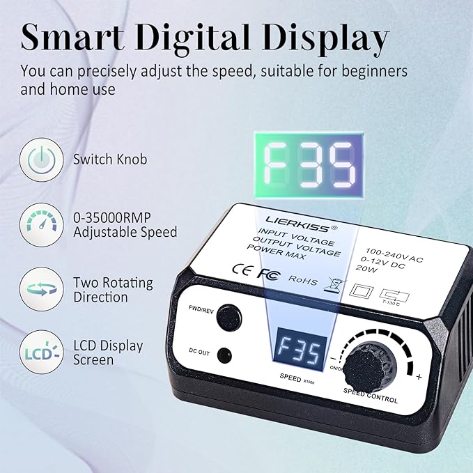 - Powerful Nail Drill: LIERKISS electric drill nails has a high-torque motor that delivers stable current power and speed, so you don't have to worry about the electric nail drill being weak or running out of power at any time, even the hardest nails can be easily handled.