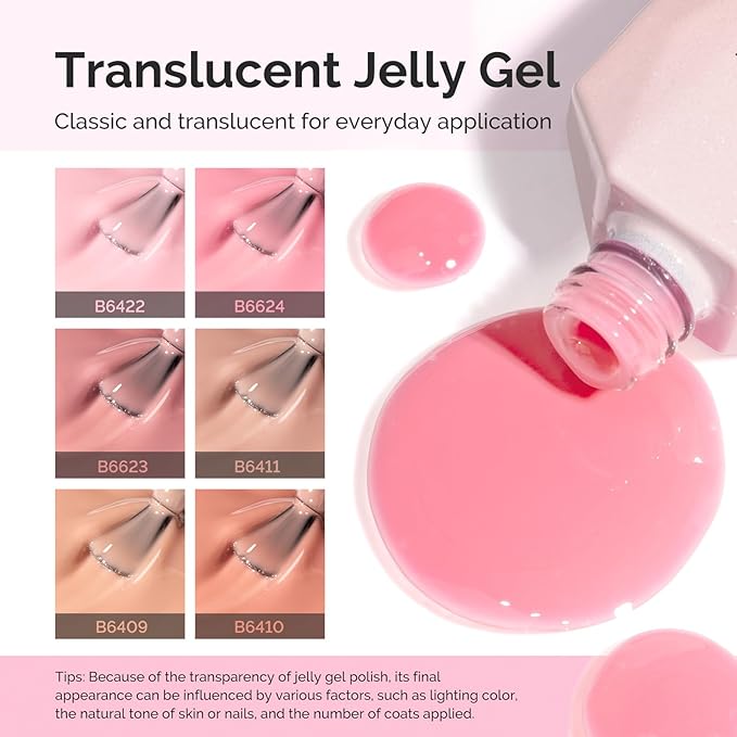 - 6PCS 7.5ML GEL NAIL POLISH:This jelly gel nail polish gives your nails a jelly-like transparent effect. This effect depends on the number of layers applied. Apply one to two layers to see a jelly-like transparent effect, and three layers can transition to an opaque color.No matter how many layers you apply, you can show the beautiful color of your nails and embrace the transparent nail art trend