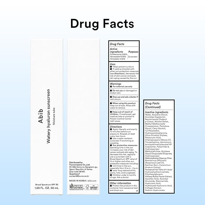 Abib Watery Hyaluron Sunscreen Moisture Tube Broad Spectrum SPF 30 1.69 fl oz / 50ml | Korean Suncreen Suncare Sunblock No White cast Reef Safe Hyaluronic Acid Niacinamide Vitamin C Collagen