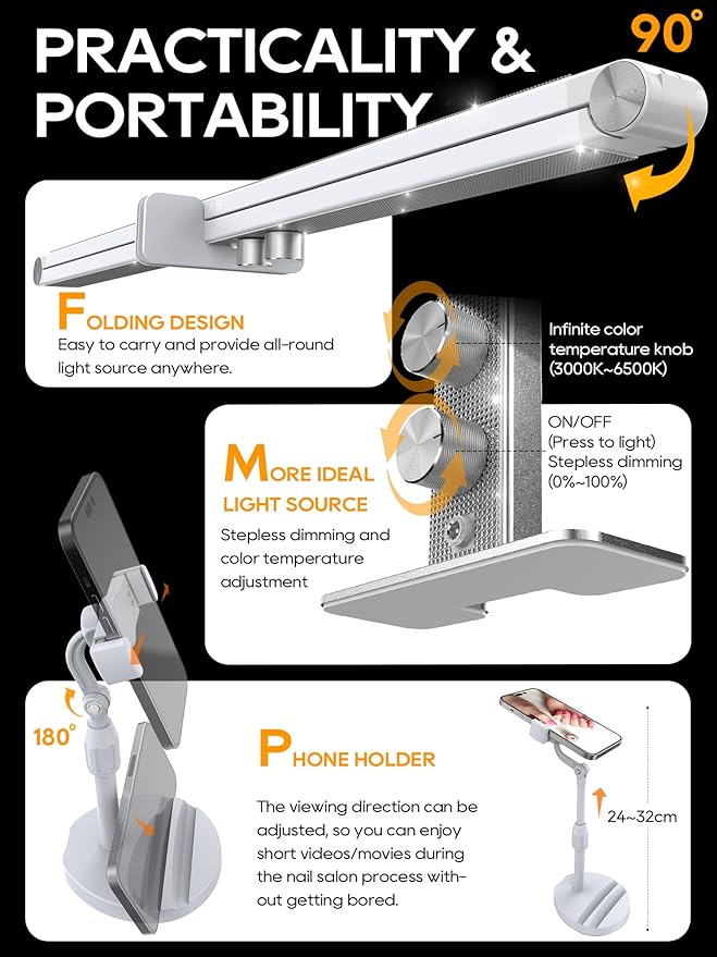 Upgraded Nail Tech Lamp for Desk, 32 in Foldable Large Nail Light with Phone Holder, 3000K-6000K CRI>95 LED Manicure Lamp, Half Moon Light for Lash Eyelash Extension, Tattoo, Eyebrows-Diamond White